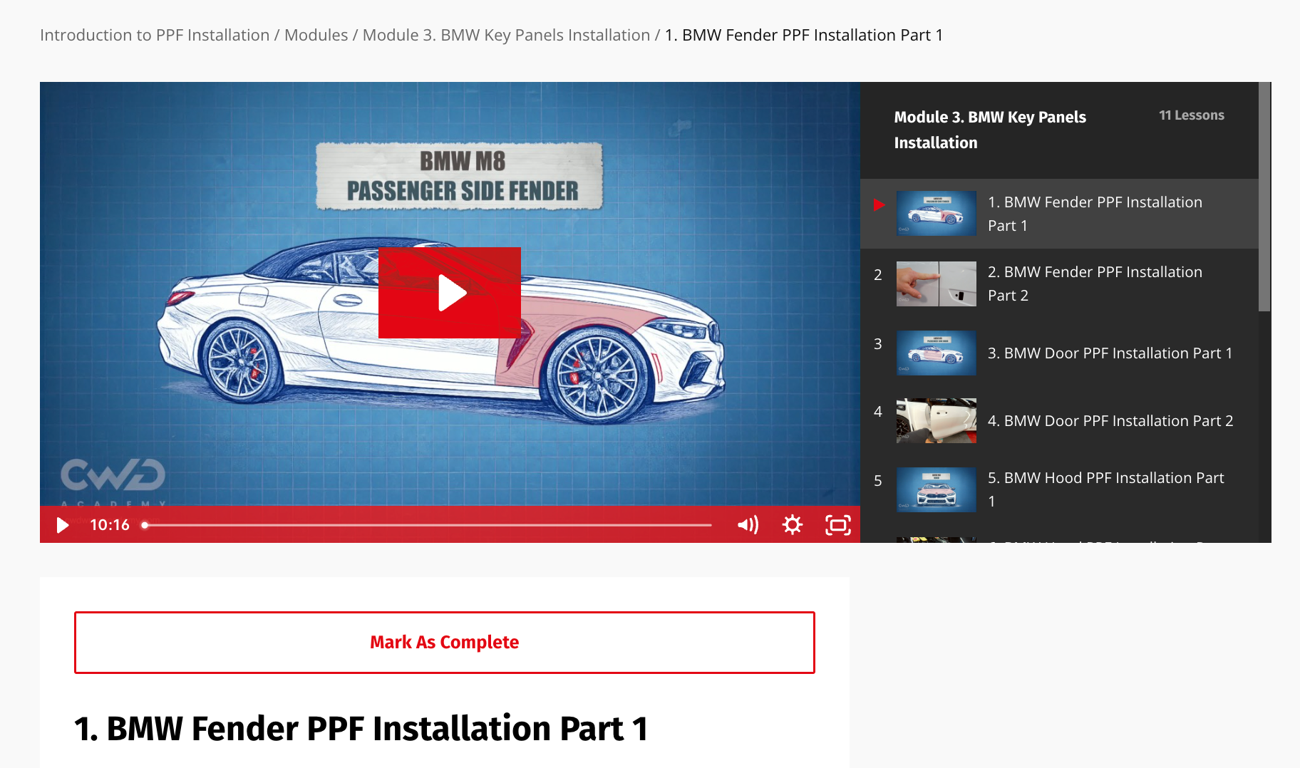 This course gives beginners a clear introduction to the world of PPF installation through CWD standards, essential tools and prep, and real-world panel demonstrations on actual vehicles. You’ll learn how professional installers think, how they prepare, and how high-level PPF work is approached panel by panel.